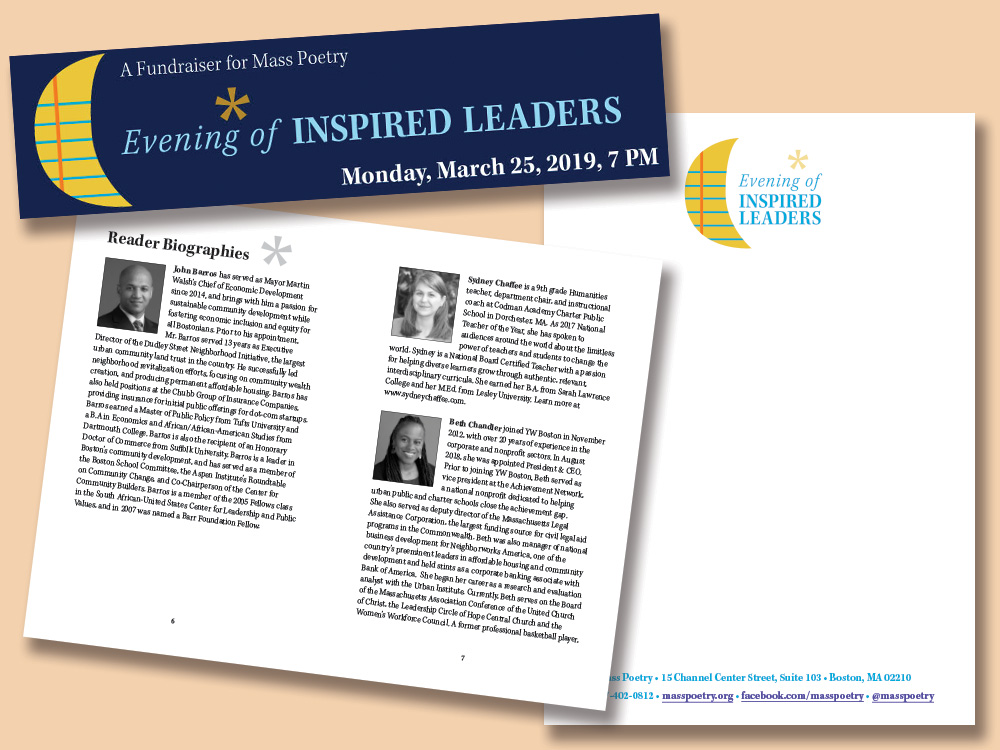 Branding and collateral design for Mass Poetry Evening of Inspired Leaders event (online ad, program, letterhead)